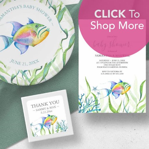 Den här inbjudan till tropisk babydusch innehåller ord "Baby Shower" som är placerad i en snyggt-handskriven manustypografi i turkosblått med händelsedetaljer i ett klassiskt serif-teckensnitt i kol-grått på en skarp vit bakgrund med en grund-boarder av min handmålade söta vattenfärgstropiska fisk, stjärnfisk, havskoral och sjögräs. Inbjudan-kortet återgår till ett extra blått färg. En unik men enkel idé för ett tema under The Sea eller en babydusch. Om du vill se hela sommartemat för babyduschen från Victoria Grigaliunas besöker du www.zazzle.com/dotellabelle