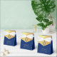 An elegant blue and gold baptism favor box, recommended for a boy. The flap is faux gold foil and it has a blue crest with a cross in it.