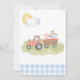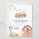 Den berömda gårdens kallelse till babydusch med boskap, en lada och blå gingham-skrift.