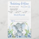 Pojkar duschspel med söt baby-elefant på en blå blommigt grön bakgrund. De här barnduschspelsflygarna är dubbla med två olika spel.