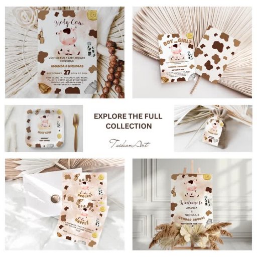 Boho-genderna för vattenfärgen neutralt visar inbjudan, med söt heliga ko, handskrivet skript, ko avger brun beige färg, i en rustiskt modern bohemisk stil. Glöm inte att utforska fullt. 🐮