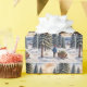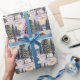 A young boy in a red hat and blue coat pulls a sled filled with Christmas greenery through a snowy forest, with a cozy cabin nestled among the trees in the distance