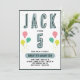 Den här söta 5:e moderna barnen-födelsedagsinbjudan har färgstarka ballongbilder, barnvänlig typografi och en vit bakgrund med en aning mörk grönt. Anpassa den med pojkens namn och ålder. Ursprungligen designad för en 5-årsdag kan du enkelt redigera åldern under "Anpassa den här mallen" för ett annat firande!
