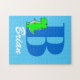 Boys namn med början. Cute grönt dinosaur teckning. Dekorativt pussel. Text kan redigeras för att göra det här pusslet unikt.