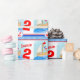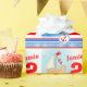 Papper med dagsljus med liten träbåt med segel och flagga på en vindag till havs i blått och rött med rand och ett ankare. Anpassa den här vita pojkens födelsedag papper med ditt namn och din ålder. I dag står det Jamie 2. Sarah Trett målade på ett unikt sätt i vattenfärg och designat.