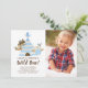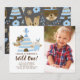 Fokusera trädsdjur och fotofödelsedagsinbjudan "Vild 1" på en vit bakgrund med ett samordnat mönster bakåt.