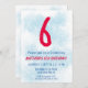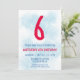 Barn i 6e-födelsedagspressen Blue party 6e födelsedagsfest inbjudan under sex år med roligt typsnitt och roligt vattenfärgsnummer.