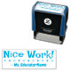 Den här positiva utformningen av gummi frimärke innehåller det inspirerande återkopplingsmeddelandet "Nice Work!" och en skräddarsydd lärare i namn. Den har även dekorativa stjärnformer. Det skulle kunna användas av en skollärare, lärare, instruktör eller lärare när de graderar student, för att visa att ett student har utfört ett enastående arbete.