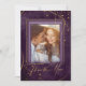 En vattenfärgsbakgrund i plommons nyans fylls av en abstrakt av bra guld linjer och glittrande ljuseffekter som skapar biet i denna vackra bröllop svit. Det här "Tack"-kortet i bröllop har även kalligrafi för elegant och ram för övertoning för fotot. Lägg enkelt till ditt eget personliga tackmeddelande på baksidan med den angivna mallen. Sök i ID867 om du vill se andra delara och färg-alternativ för den här uppsättningen.