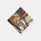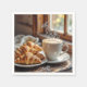En kopp av kaffe med "Bra Morgon" skriven på framsidan på ett bord bredvid en nybakad skithölje.