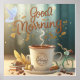 En 3D-bildande illustration av en mysigt scen och en snyggt där det varma kaffet kopp går i centrum. Vintagens cykel, ett bok med fladderande sidor, och den sanna naturinspirerade texten "Bra morgon" är konstgjort placerad runt kaffet kopp. Ambitionen är fylld med mjukt, gyllene solljus, och naturligt inslag som löv och grenar är sömlöst integrerade. Den övergripande sammansättningen är en blandning av mode och illustration, med en vintage charm., illustration, 3d-rendering, mode, typografi