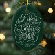 Elegant, handskrivna prydnadsföremål med frasen "Bra tiings of såväl komfort som glädje" och dekorativa accenter i vitt mot mörk grönt bakgrund. Anpassa utsmyckningens framsida genom att lägga till ditt namn och året. Lägg till ditt favoritfamiljefoto på baksidan för ett anpassad design!