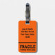 Bagage eller hänger lös märkren i orange med texten, "bräckligt, handtaget med omsorg".