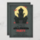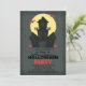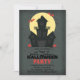Eerie Haunted House Party bjudande in till ett eerie hemsökt hus med rött fladdermus och jack o'lanternor mot en blek gult måne.