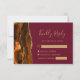 Det moderna djurutrymmeskortet i elegantens lämnat kant har en bränd orange vattenfärgad agate i gräns som trimmas med faux guld glitter. Rubriken "Kinly Reply" visas i handskriftsskript, med anpassade nedanför i guld färgad-typsnittet på en burgundisk bakgrund. Den omvända sidan har en matchande bränd orange och guld agate-design. En perfekt färg-kombination för ett fallbröllop!