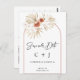 Modern minimalistisk Spara datum vykort med en terrakotta båge och torkad blomsterarrangemang med brända orange rosor, vita fruktträd och palmkvistar. Denna design har också parets initialer, modern kalligrafi bildrubrik och baksidan är förberedd för parets adress och meddelande.