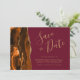 Den här eleganten är modern när du sparar datumkortet och har en bränd orange vattenfärgsagat gräns som trimmas med faux guld glitter. Anpassadet kombinerar handskriftsskript för guld färgad, tryckplåt och kursivt typsnitt på en burgundisk bakgrund. Den omvända sidan har en matchande bränd orange och guld agate-design.