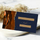 Den här eleganten har det moderna platskortet för säten i bröllop bord en bränd vattenfärg i orange som ruttnar gräns med guld faux glitter. Kortets framsida ger utrymme för gästernas namn och bordsnummer i form av rektanglar i färgaden guld på en mörk med blå bakgrund. Ord "bord" visas i handskriftsskriptet guld färgad med dekortecken före och efter. Anpassa kortets baksida med namn på briden och trippen i handskriftsskriptet guld och bröllop-datumet nedan i sans serif-teckensnitt.