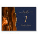 Det moderna kortet för bordsnummer i bröllop som är lämnat kant i eleganten har en bränd vattenfärgad orange-agat i gräns som trimmas med faux guld glitter. Anpassadet kombinerar handstil för guld färgad och kursiv och sammanfogad typsnitt på en mörk marin blå bakgrund.
