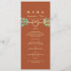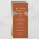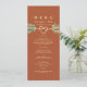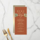 Modern, elegant, rustik terracotta brände orange bröllop-menyn med guld-rep och eukalyptus greenery.