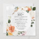 Ät en speciell kvinna med den här eleganten 100 Födelsedagsfest inbjudan. Bränd orange och vita blommor kapas i grönt löv från ett modernt botaniskt ram. Vita snöre mönster skapar en vacker bakgrund. Hela texten kan redigeras så att du kan beskriva ditt speciella firande perfekt