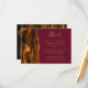 Den vänstra kanten på detta eleganta moderna bröllopsdetaljkort har en bränd orange vattenfärg-agat-kant med falskt guldglitter. Titeln visas i handskriven stil, med anpassningsbar text nedan i guld-färgad kopparplåt-font på en burgunderfärgad bakgrund. Baksidan har en matchande bränd orange och guld-agat-design. En perfekt färgkombination för ett höstbröllop!