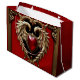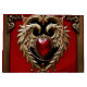 Branden och guld. Denna opulenta konstruktion har en ornat guld ram som är uppställd mot en djup röd bakgrund, som utesluter en lyx och elegans. Den utklädda ruby hjärta är skickligt försedd med gyllene vingar som ger den en grå ljushet, liksom med delikata guld-smycken som understryker dess sofistikering. Samspelet mellan tonerna i rik guld, luminösa rubies och den djupa röda bakgrunden skapar en lyxrik och sensuell estetik som på ett imponerande sätt förenar romantik och opulens.