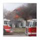En keramisk bricka med ett foto av lastbilar framför en husbrand.