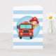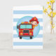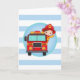 Denna design har en söt brandman med brunt hår i sin brandbil och vinkar hej! Röd, blå, gul och turkos med breda ränder.