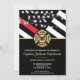 Denna inbjudan till brandmanspension har en brandmänsflagga med svarta och vita ränder och en tunn röd linje. Ett brandmansmärke sitter ovanför all information om festen för den pensionerade brandmannen, löjtnanten eller chefen. Inbjudningarna kan också anpassas för en brandman som har tagit examen från brandmannaskolan.