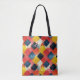 Öga fångande till ett mönster med en pulserande abstrakt geometrisk med rött, gult och blå diamanter. Perfekt för moderna stil-entusiaster och dem som kärlek djärvt och färglöst formgivning. Det här är idealiskt för daglig använda, shopping eller som en unik gåva. Uttryck din konstnärliga sida med den här dynamiska designen som kombinerar feta former och träffande färg.
