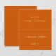 Enkel bränt orange bröllopsbordskort med gästnamn och bordnummer tryckt på framsidan och brud och brudgum namn och bröllopsdatum tryckt på baksidan (alltså den andra halvan, innan den viks). All text är skriven med gyllengul kalligrafisk stil.