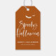Lägg till en kusligt söt touch till dina halloweenpresenter och godsaker med dessa redigerbara halloween-märkningsetiketter. Med handskrivna vita bokstäver på en bränd orange bakgrund ger de moderna halloween-vibbar till vilken fest som helst. Använd dem till godispåsar, tackgåvor eller som etiketter för hemmagjorda höstgodisar. Det finns utrymme att lägga till ett namn eller ett meddelande för en personlig touch. Dessa etiketter får din halloweenfirande att sticka ut på bästa sätt.