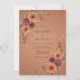 Denna design har en varm terrakotta-bakgrund prydd med frodiga blomsterbuketter i nyanser av bränt orange och djup burgunder. Levande krysantemum och dahlior är parade med ömtåliga bär och dämpad grön lövverk för att skapa en rik säsongsestetik. Atmosfären är mysig och inbjudande, vilket gör den idealisk för ett sent års äktenskapshändelse.