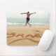 COPYRIGHT Stephanie Rabemiafara / DanitaDelimont.com| AF36 SRA0000.jpg| BRASILIEN. Barechest man med badande kostym som hoppade på sanden över namn Brasilien i sanden och hoppade över havet