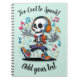 Lås upp din spöklika kreativitet med den här energiska Halloween-anteckningsboken! Den har en breakdansande skelett med hörlurar och sneakers och det roliga citatet “Too Cool to Spook!”, perfekt för skolanteckningar, klotter eller Halloween-planer. Personalisera den med ditt namn på omslaget!