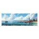 Bredd Sjölandskap i Medelhavet. Kustvyn med stiliserade vattenfärgrekornseffekter växer fram med en liten yacht som långsamt och seriöst glider igenom den lugn, azure vatten. Nearby, den traditionella Medelhavsbyn med sitt vita tvättat byggnad och terracotta tak avskyler mot avlägsna backe, förkroppsligar ett avslappnat liv och skönhet.