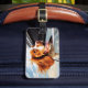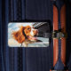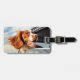 En orange och vit Bretagne-spaniel med lång, flytande päls håller huvudet ur bilfönstret. Hund tunga hänger ut och dess öron flaxar i vinden. Hund päls är en blandning av brunt och vitt, och ögonen är brunt. Bakgrunden är ett blå himmel med vita moln. Bilden har en glad och lekfull stämning, som ger glädje av en hund som åker bil. Perfekt för Bretagne älskare.