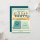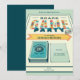 Brettspelsfestinbjudan med en rolig typografi av "Brettspelsfest". Denna design inkluderar element i blått, gult, rött och orange, en spelbräda som bakgrund, tärningar, spelpjäser, spelkort och element inspirerade av brädspel. Produkter inkluderar en mall för personlig anpassning.