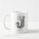 Anpassade, vitt kaffe mugg med brev J i unik mörk-färgad-typografi. Lägg till ditt namn med hjälp av anpassningsfunktionen.