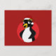 Vykort med en illustration av en söt krämt penguin med en röd julhatt; för barn för utformning av julens tecknad, på en röd bakgrund