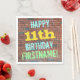 Den pappra napkin-designen med roligtens födelsedag innehåller ett meddelande som "LYCKLIG 11:e BIRTHDAY, FIRSTNAME!", där namn kan vara personlig. Bakgrunden är en återgivning av en tegelvägg som består av några rödbruna tegelstenar av färgad. Anpassadets meddelandetext har färg som blått, gult och grönt, och det har ett utseende som inspirerats av den målade graffiti. Napkins som dessa kan kanske användas i en födelsedagsfest till någon som firar sin elfte födelsedag. [~Z0000271]