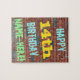Den här roligtens födelsedagstäckande pussel har ett meddelande som "LYCKLIG 14:e BIRTHDAY, NAMN-HERE!", där namn kan vara personlig. Bakgrunden är en återgivning av en tegelvägg som består av några rödbruna tegelstenar av färgad. Anpassadets meddelandetext har färg som blått, gult och grönt, och det har ett utseende som inspirerats av den målade graffiti. Ett sådant pussel skulle kunna användas som roligt för att skicka önskemål till någon som firar sin fjortonde födelsedag och som kanske verkligen gillar att göra pussel. [~Z0000285]
