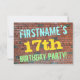 Födelsedagsfest inbjudan-designen i roligt innehåller ett meddelande som "FIRSTNAME's 17:e FÖDELSEDAGSFESTEN!", där namn kan vara personlig, på framsidan. Bakgrunden är en återgivning av en tegelvägg som består av några rödbruna tegelstenar av färgad. Anpassadets meddelandetext på framsidan har färg som blått, gult och grönt, och det har ett utseende som inspirerats av den målade graffiti. Baksidan innehåller ett anpassade som kan innehålla relevant information om födelsedagsfesten. Födelsedagsfest inbjudan som detta kan vara ett roligt till inbjudan familj och vänner till en födelsedagsfest för någon som firar sin sjuttonde födelsedag. [~Z0000287]