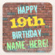 Den här roligtens födelsedagstext underlägg designfunktioner som "LYCKLIG 19:e BIRTHDAY, NAMN-HERE!", där namn kan vara personlig. Bakgrunden är en återgivning av en tegelvägg som består av några rödbruna tegelstenar av färgad. Anpassadets meddelandetext har färg som blått, gult och grönt, och det har ett utseende som inspirerats av den målade graffiti. Underlägg som dessa kan vara användbara som praktiska dekorationer i en födelsedagsfest för någon som firar sin nittonårsdag. [~Z0000288]