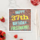 Den pappra napkin-designen med roligtens födelsedag innehåller ett meddelande som "LYCKLIG 37:e BIRTHDAY, FIRSTNAME!", där namn kan vara personlig. Bakgrunden är en återgivning av en tegelvägg som består av några rödbruna tegelstenar av färgad. Anpassadets meddelandetext har färg som blått, gult och grönt, och det har ett utseende som inspirerats av den målade graffiti. Napkins som dessa kan kanske användas i en födelsedagsfest till någon som firar sin trettiosjunde födelsedag. [~Z0000271]