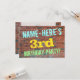 I födelsedagsfest inbjudan-roligten finns ett meddelande som "NAMN-HERE's 3rd BIRTHDAY PARTY!", där namn kan vara personlig, på framsidan. Bakgrunden är en återgivning av en tegelvägg som består av några rödbruna tegelstenar av färgad. Anpassadets meddelandetext på framsidan har färg som blått, gult och grönt, och det har ett utseende som inspirerats av den målade graffiti. Baksidan innehåller ett anpassade som kan innehålla relevant information om födelsedagsfesten. Födelsedagsfest inbjudan som detta kan vara ett roligt till inbjudan familj och vänner till en födelsedagsfest som hålls för någon som firar sin tredje födelsedag. [~Z0000287]