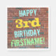 Den pappra napkin-designen med roligtens födelsedag innehåller ett meddelande som "LYCKLIG 3:e BIRTHDAY, FIRSTNAME!", där namn kan vara personlig. Bakgrunden är en återgivning av en tegelvägg som består av några rödbruna tegelstenar av färgad. Anpassadets meddelandetext har färg som blått, gult och grönt, och det har ett utseende som inspirerats av den målade graffiti. Napkins som dessa kan kanske användas i en födelsedagsfest till någon som firar sin tredje födelsedag. [~Z0000271]