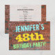 I födelsedagsfest inbjudan-roligten finns ett meddelande som "JENNIFER:s 48:e FÖDELSEDAGSFEST!", där namn kan vara personlig, på framsidan. Bakgrunden är en återgivning av en tegelvägg som består av några rödbruna tegelstenar av färgad. Anpassadets meddelandetext på framsidan har färg som blått, gult och grönt, och det har ett utseende som inspirerats av den målade graffiti. Baksidan innehåller ett anpassade som kan innehålla relevant information om födelsedagsfesten. Födelsedagsfest inbjudan som detta kan vara ett roligt till inbjudan familj och vänner till en födelsedagsfest som hålls för någon som firar sin fyrtioåttonde födelsedag. [~Z0000287]