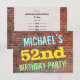 Roligten födelsedagsfest inbjudan har ett meddelande som "MICHAEL's 52:a FÖDELSEDAGSFESTEN!", där namn kan vara personlig, på framsidan. Bakgrunden är en återgivning av en tegelvägg som består av några rödbruna tegelstenar av färgad. Anpassadets meddelandetext på framsidan har färg som blått, gult och grönt, och det har ett utseende som inspirerats av den målade graffiti. Baksidan innehåller ett anpassade som kan innehålla relevant information om födelsedagsfesten. Födelsedagsfest inbjudan som detta kan vara ett roligt till inbjudan familj och vänner till en födelsedagsfest för någon som firar sin femtioandra födelsedag. [~Z0000287]